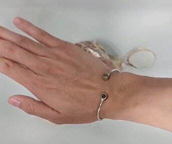 Each elegant bangle features two hidden photos inside shimmering gemstone charms — simply shine a light or look closely into the center to reveal them.